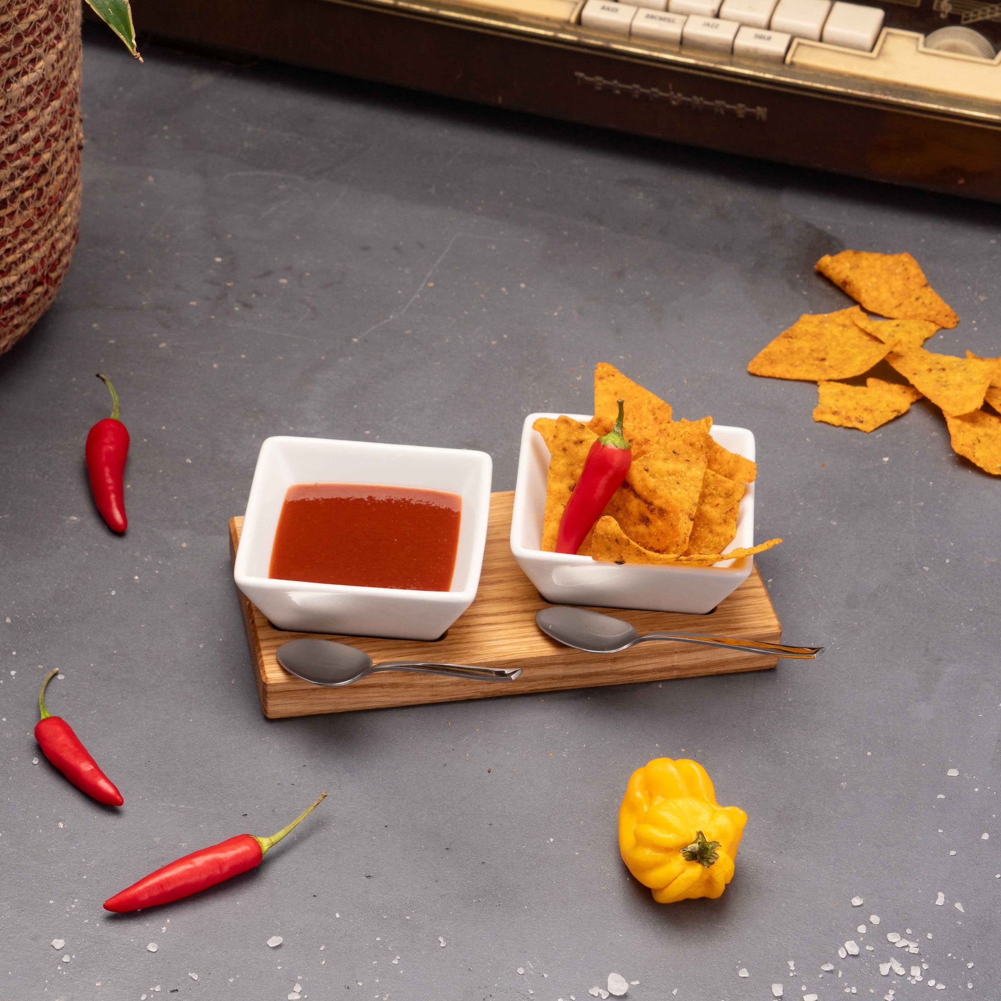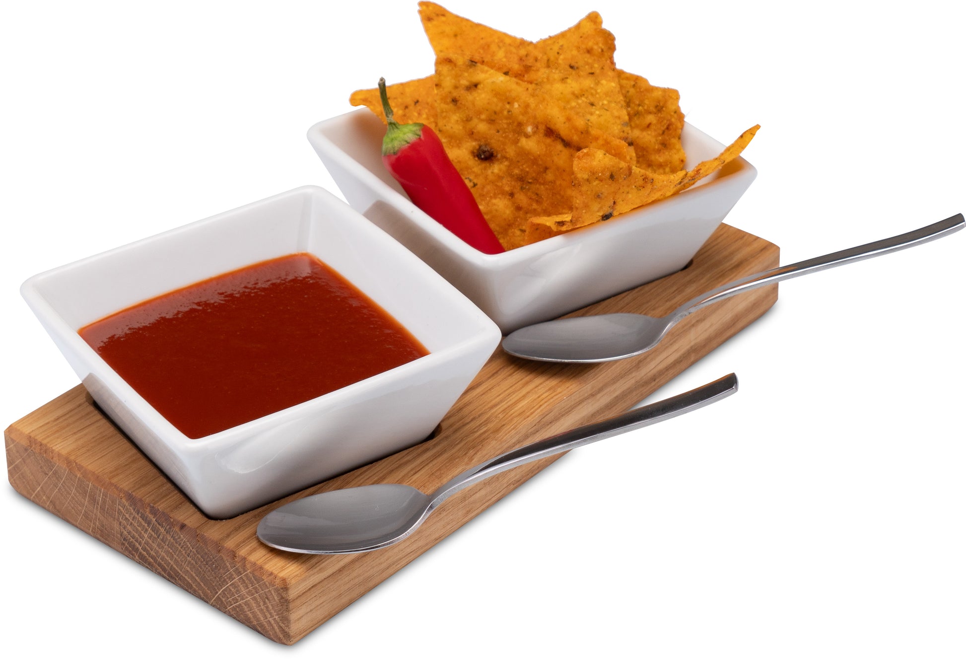 Die kleinen weißen Keramikschälchen thronen auf dem edlen Holztablett aus Eichenholz – schlicht, modern und zeitlos schön.